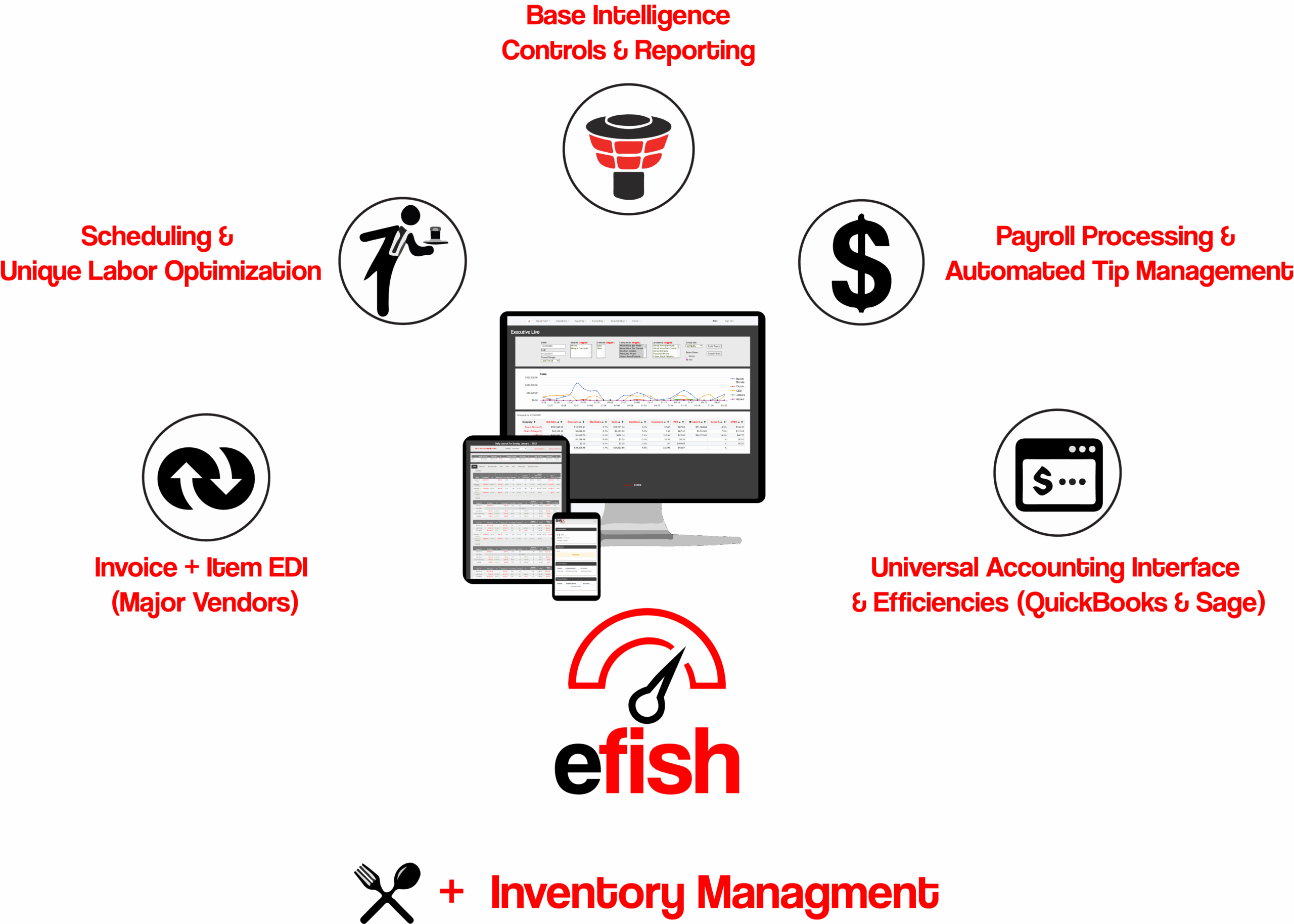 efish brings your entire operation into one connected system — accounting, labor, scheduling, inventory, and vendor management — eliminating the gaps, delays, and inconsistencies that slow restaurants down. With everything flowing through a single platform, your team always has the information they need.